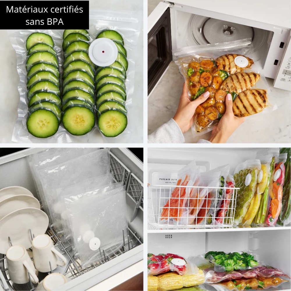 Nous recommandons d’utiliser les sacs FreshPreserve pour garantir une aspiration et une étanchéité parfaites. Leur valve brevetée et leur texture renforcée assurent une durabilité et une performance supérieures.